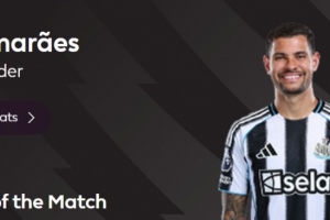90分钟绝杀,英超官方:吉马良斯当选纽卡2-1富勒姆全场最佳