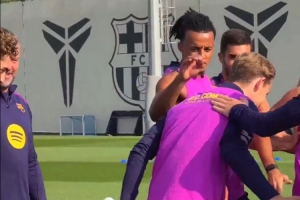 体育资讯10月16日讯 巴萨球员在训练时列队欢迎德容和费尔明,并对他们致以拍头礼进行祝贺。