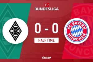 半场-拜仁暂0-0十人门兴 迪亚斯开场失单刀 卡斯特罗普飞铲染红