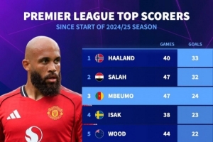 上赛季至今英超射手榜:哈兰德反超萨拉赫,姆伯莫、伊萨克列前四